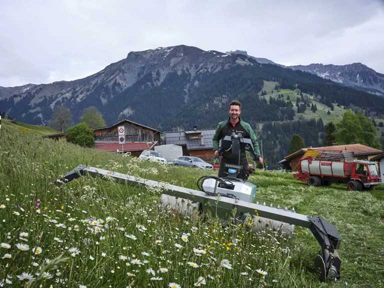 Der elektrische Einachser hat auch arbeitswirtschaftliche Vorteile. Die Maschine hat viel mehr Drehmoment und Schubkraft beim Arbeiten. Andrea Flütsch ist sehr zufrieden mit den Geräten. Natürlich müsse man die Arbeit und das Aufladen damit besser organisieren. Bislang sind die Haupteinsätze der Maschine: Mähen, Heuabräumen und Heuschwaden.