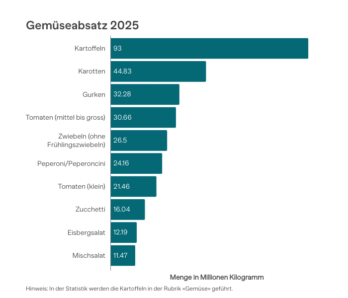 Insgesamt wurden in diesem Bereich 463 Millionen Kilogramm über den Detailhandel verkauft, davon 93 Millionen Kilogramm Kartoffeln – 3 Prozent mehr als im Jahr zuvor. Meistverkauftes Gemüse waren die Karotten mit 44,83 Millionen Kilogramm, gefolgt von Gurken und mittleren und grossen Tomaten. Würde man auch die kleinen Tomaten hinzuzählen, nähmen die Tomaten allerdings den Spitzenplatz ein.