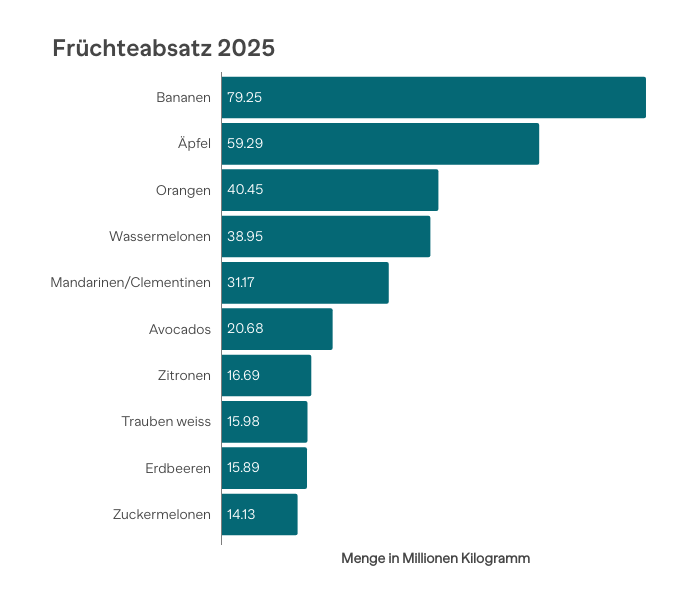 Zuoberst auf dem Treppchen bei den Früchten steht mit Abstand die Banane. Über 79 Millionen Kilogramm davon setzte der Schweizer Detailhandel 2025 ab. Auf den nächsten Rängen kommen Äpfel und Orangen, gefolgt von Wassermelonen, Mandarinen respektive Clementinen sowie Avocados. Insgesamt gingen 460 Millionen Kilogramm Früchte über den Ladentisch.
