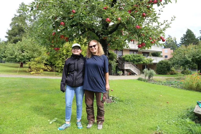Nach dem Mittagessen und einer kleinen Pause im Zimmer ziehen sich Eveline Heusser und Andrina Zünd Schuhe und Jacken an. Der Plan: Äpfel im Garten pflücken, um sie später zu verarbeiten.