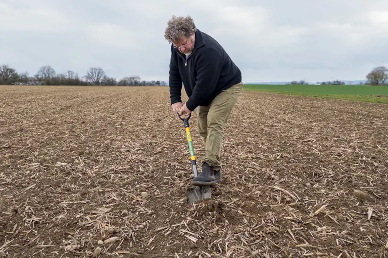 Zuerst beurteilt Axel Vohwinkel die Bodenprobe mit der Spatenprobe – auf Bodenart, Gefügestabilität, Durchwurzelung und Porenvolumen. Ergänzend folgt eine chemische Analyse.
