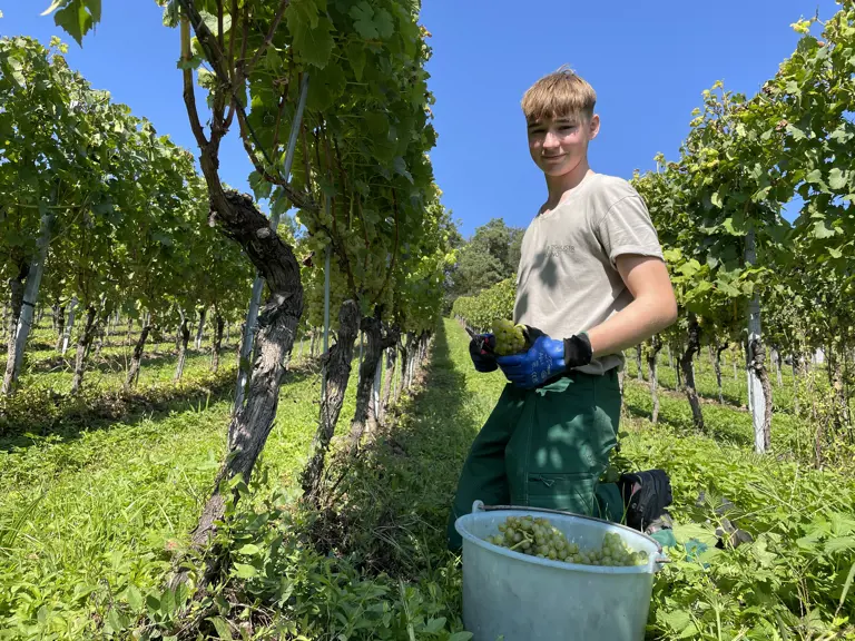 Im Spätsommer, während die Trauben reifen, stehen Unterhaltsarbeiten wie Mulchen oder das Mähen von Unkraut an. «Die Maschinenarbeit mit dem Traktor oder dem Raupenfahrzeug macht mir besonders Spass und ist spannend», berichtet der angehende Winzer weiter.
