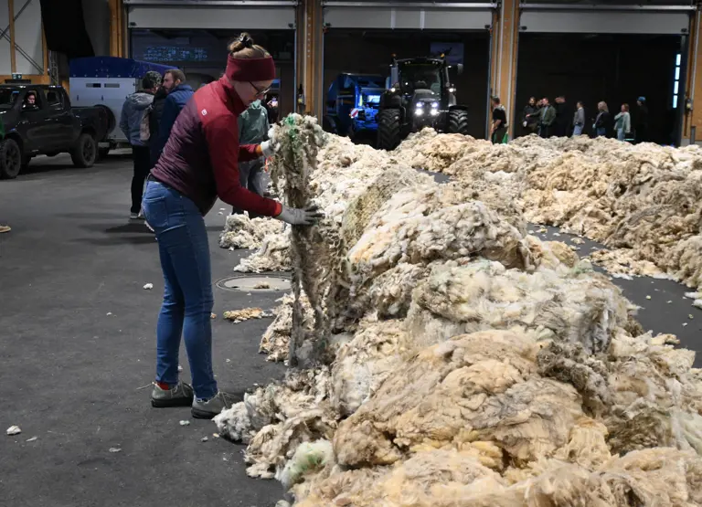 Grosse, lange Wollhaufen liegen in der Bündner Arena in Cazis im Kanton Graubünden. Zwei Linien weisse Wolle und eine Linie braune und gemischte Wolle. Mit den unterschiedlichsten Fahrzeugen stehen Bauern und Bäuerinnen aus der Region in der Schlange, um ihre Wolle an die Wollannahme von Swisswool zu bringen.