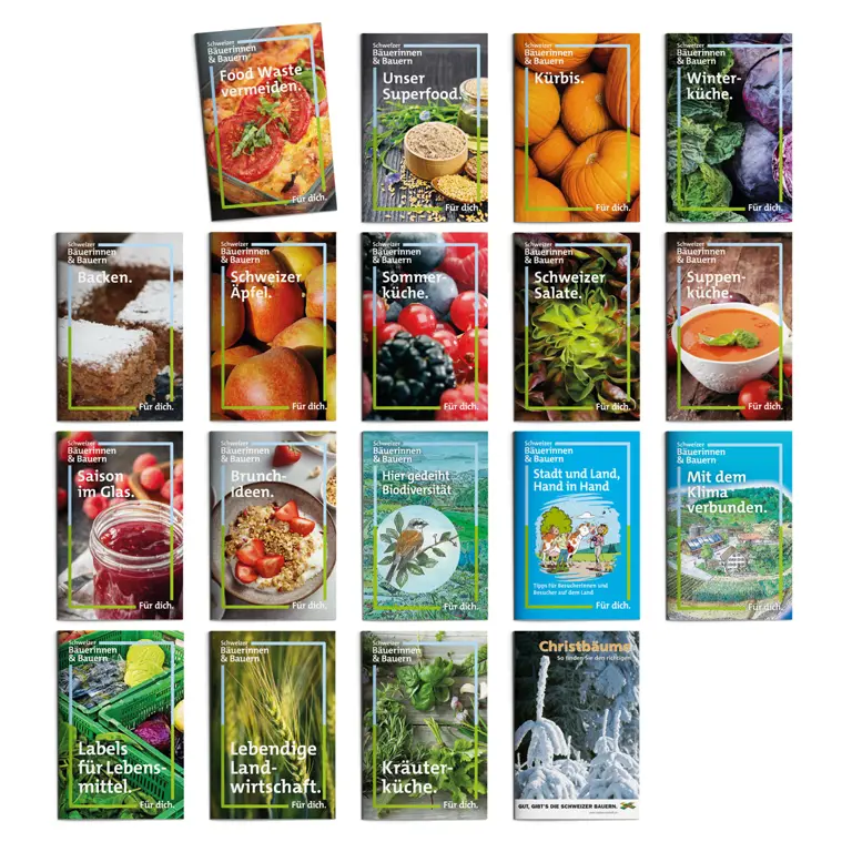 Die Minibroschüren sind eine wertvolle Informationsquelle, die Konsumentinnen und Konsumenten einen detaillierten Einblick in die Welt der Schweizer Landwirtschaft bietet. Insgesamt 18 Broschüren decken eine Vielzahl von aktuellen Themen ab, die von Saisonalität über Anbau und Sorten bis hin zu köstlichen Rezepten reichen. Durch ihr handliches Taschenformat sind sie ideal für unterwegs oder zum Sammeln und Aufhängen zu Hause geeignet. Ganz nach dem Motto «handlich, praktisch, gut».