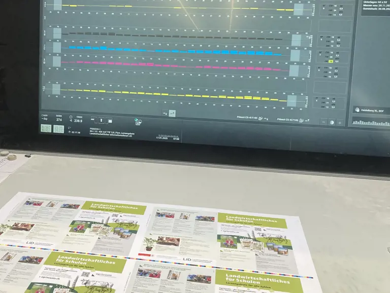 Bis anhin wurde der Flyer auf Hochglanzpapier gedruckt, ein halbmattes Papier passt jedoch besser zur Landwirtschaft. So haben wir bei der Überarbeitung das Papier gewechselt. Damit die Farben weiterhin so strahlen wie bis anhin, ist die Abstimmung an der Maschine wichtig. Daniela Carrera, Co-Bereichsleiterin Schulprojekte, war bei der diesjährigen Produktion in der Druckerei dabei, hat zusammen mit den Druckexpertinnen und Druckexperten die Farben überprüft und das OK für den Druck gegeben. Sie ist tief beeindruckt wie schnell die 122’300 Exemplare über die Walzen rollen und weiterverarbeitet werden.